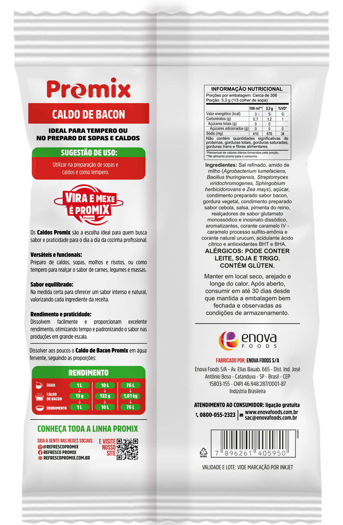 Os Caldos Promix são ideais tanto para preparo de caldos tradicionais quanto como tempero em uma infinidade de receitas. Disponíveis nas versões Galinha, Carne, Legumes e Bacon, são perfeitos para dar corpo, aroma e sabor às preparações, com excelente custo-benefício e desempenho na rotina profissional.