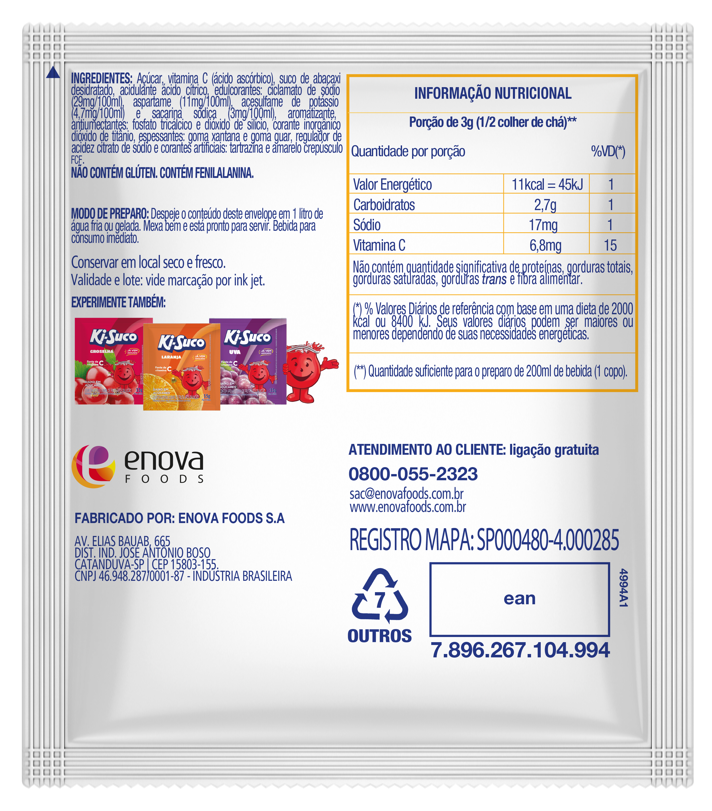 Açúcar, vitamina C (ácido ascórbico), suco de abacaxi desidratado, acidulante ácido cítrico, edulcorantes: ciclamato de sódio (29mg/100ml), aspartame (11mg/100ml), acesulfame de potássio (4,7mg/100ml) e sacarina sódica (3mg/100ml), aromatizante, antiumectantes: fosfato tricálcico e dióxido de silício, corante inorgânico dióxido de titânio, espessantes: goma xantana e goma guar, regulador de acidez citrato de sódio e corantes artificiais: tartrazina e amarelo crepúsculo FCF.